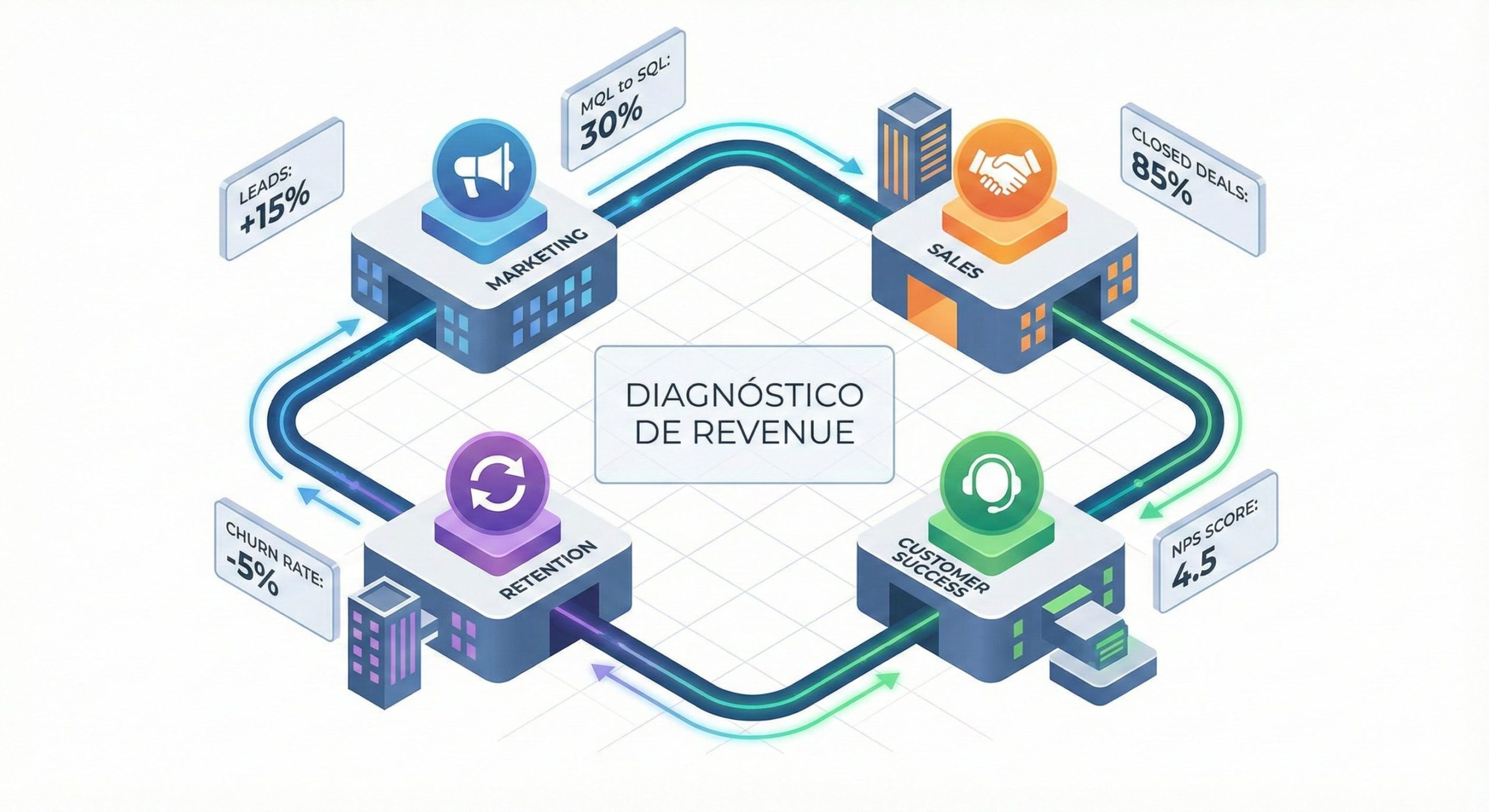 Realizamos un levantamiento profundo del estado actual de la compañía para entender con precisión dónde está y qué necesita para crecer. Analizamos el desempeño de revenue, marketing, ventas y customer success, identificando fortalezas, brechas y oportunidades de mejora. Complementamos este diagnóstico con un benchmark competitivo basado en el Revenue Benchmark Digital, que permite comparar la madurez comercial frente a referentes del mercado. Finalmente, llevamos a cabo entrevistas 360 con líderes y equipos para comprender la historia, la experiencia operativa y las dinámicas internas que influyen en los resultados. Esta mirada integral permite diseñar un plan de acción realmente conectado con la realidad de la organización.